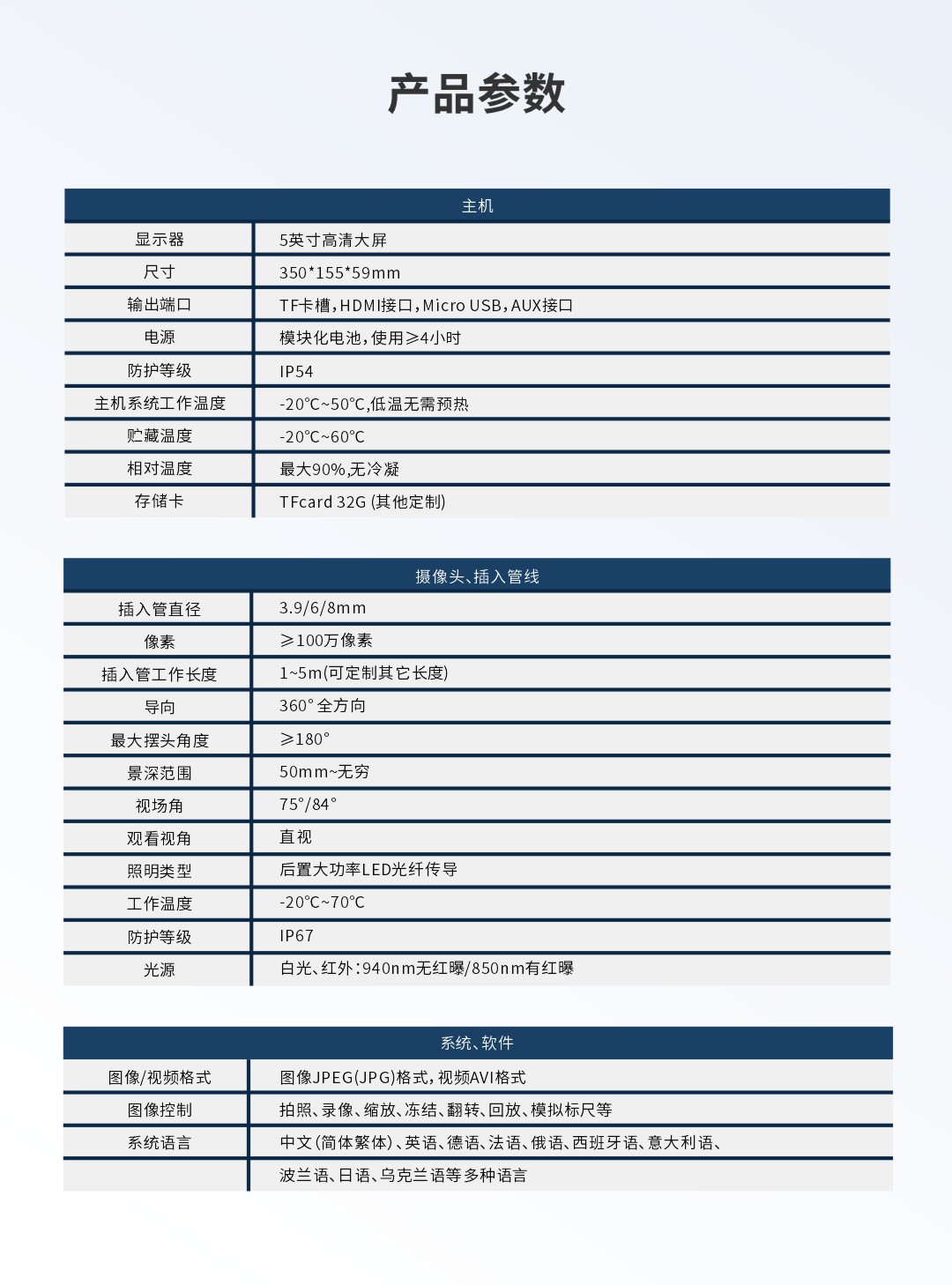 優勢特點:紅白雙光源一鍵切換;攝像頭拾音、錄音功能;探頭360°轉向;可更換不同類型管線;